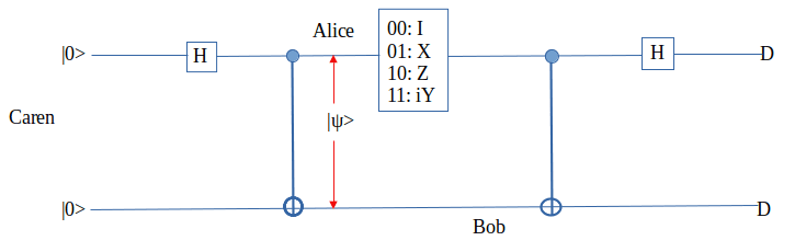 This is where Caren comes in. Caren entanglements 2 qubits through Hadamard and CNOT. It sends one of the entangled particles to Alice and the other to Bob. Alice and Bob have no information as they do not measure which particle has come to them.